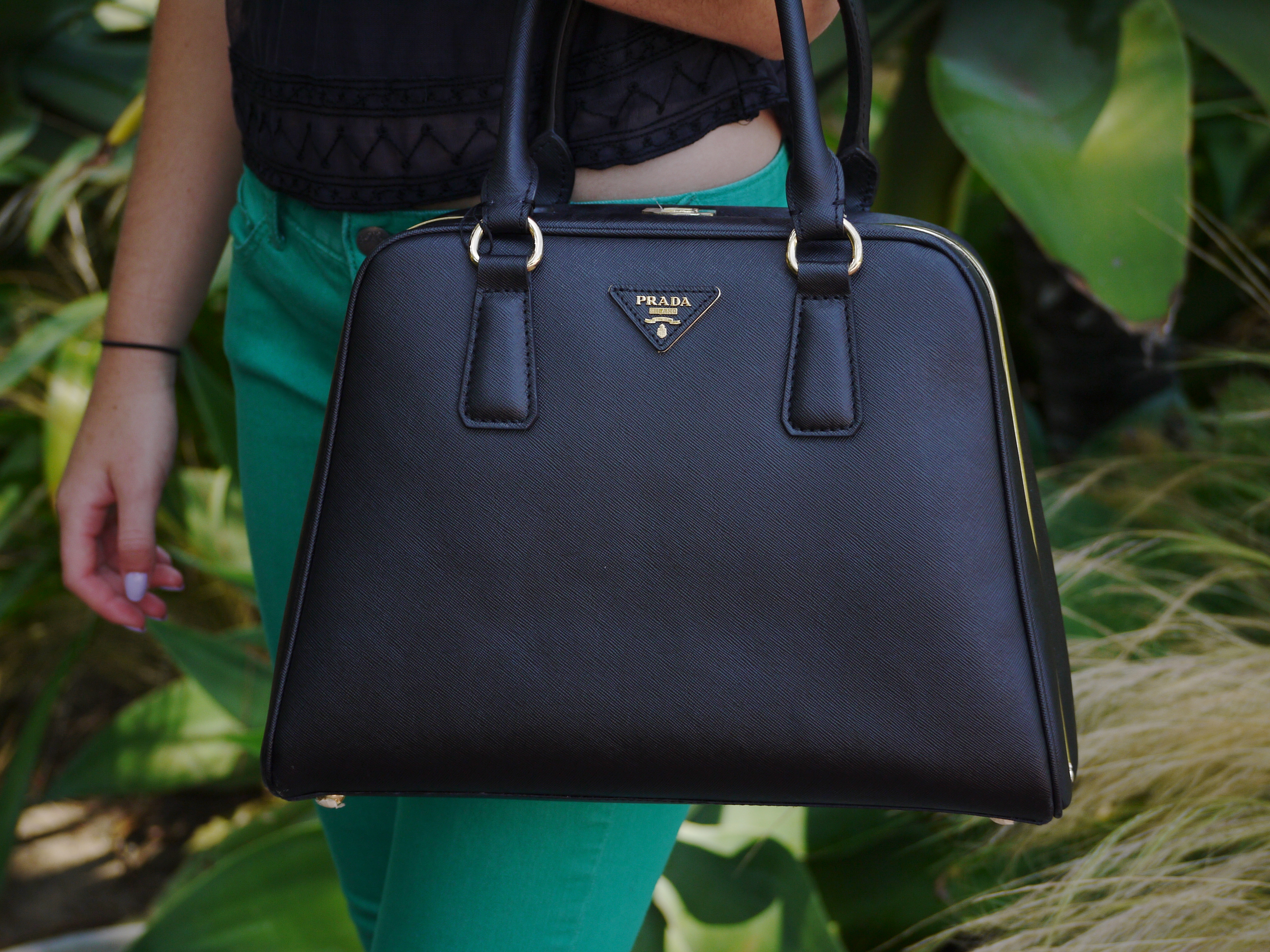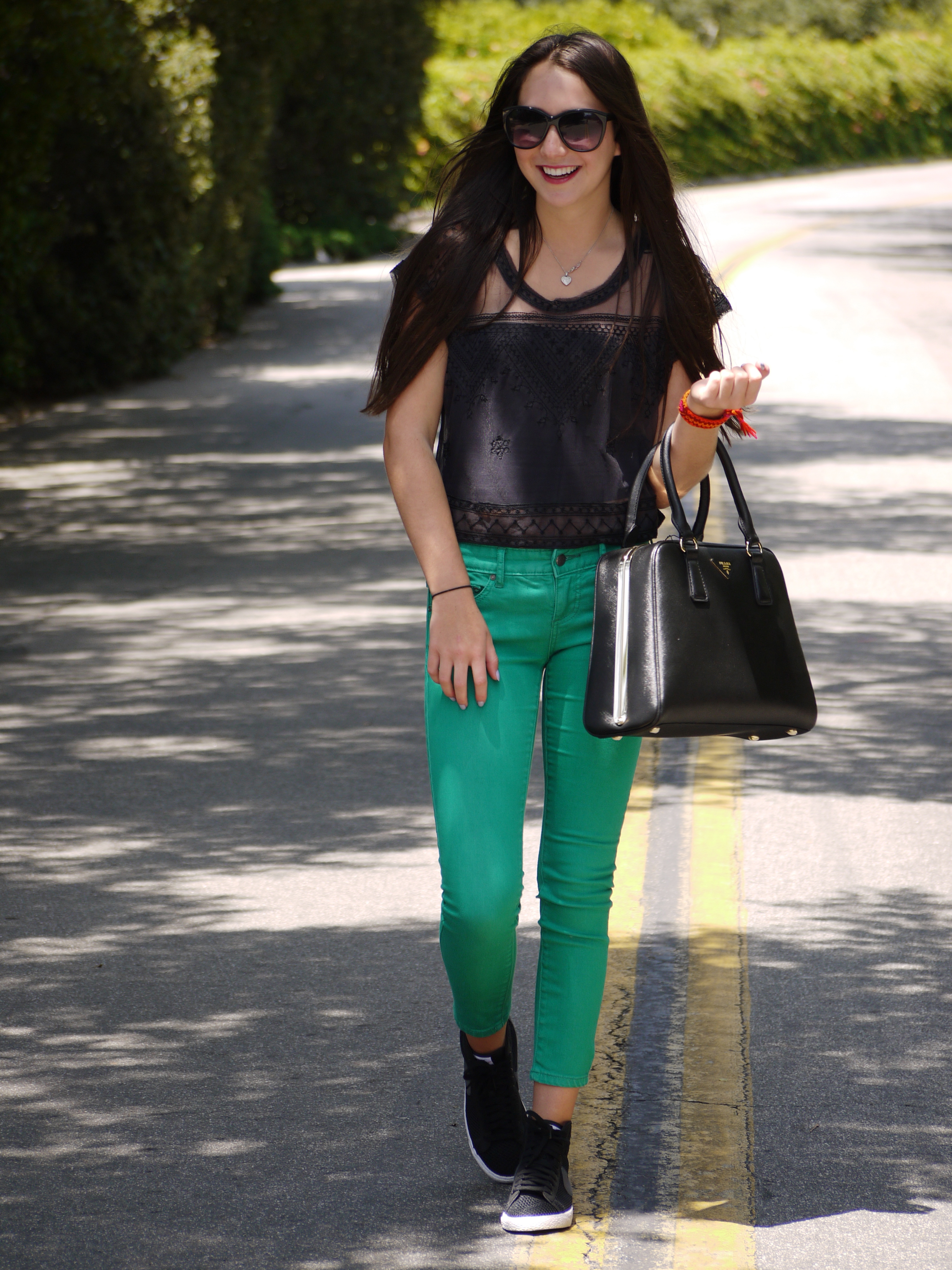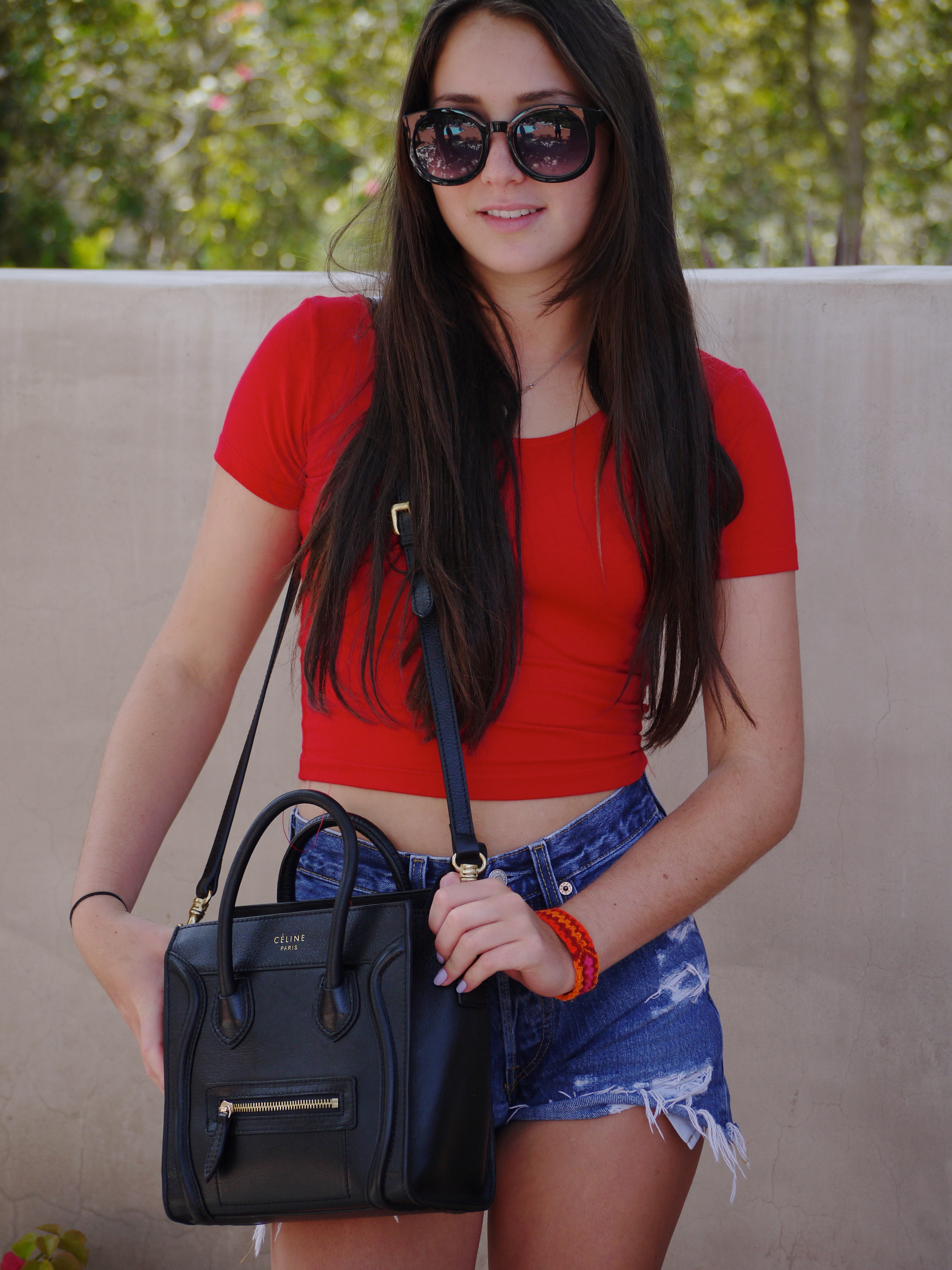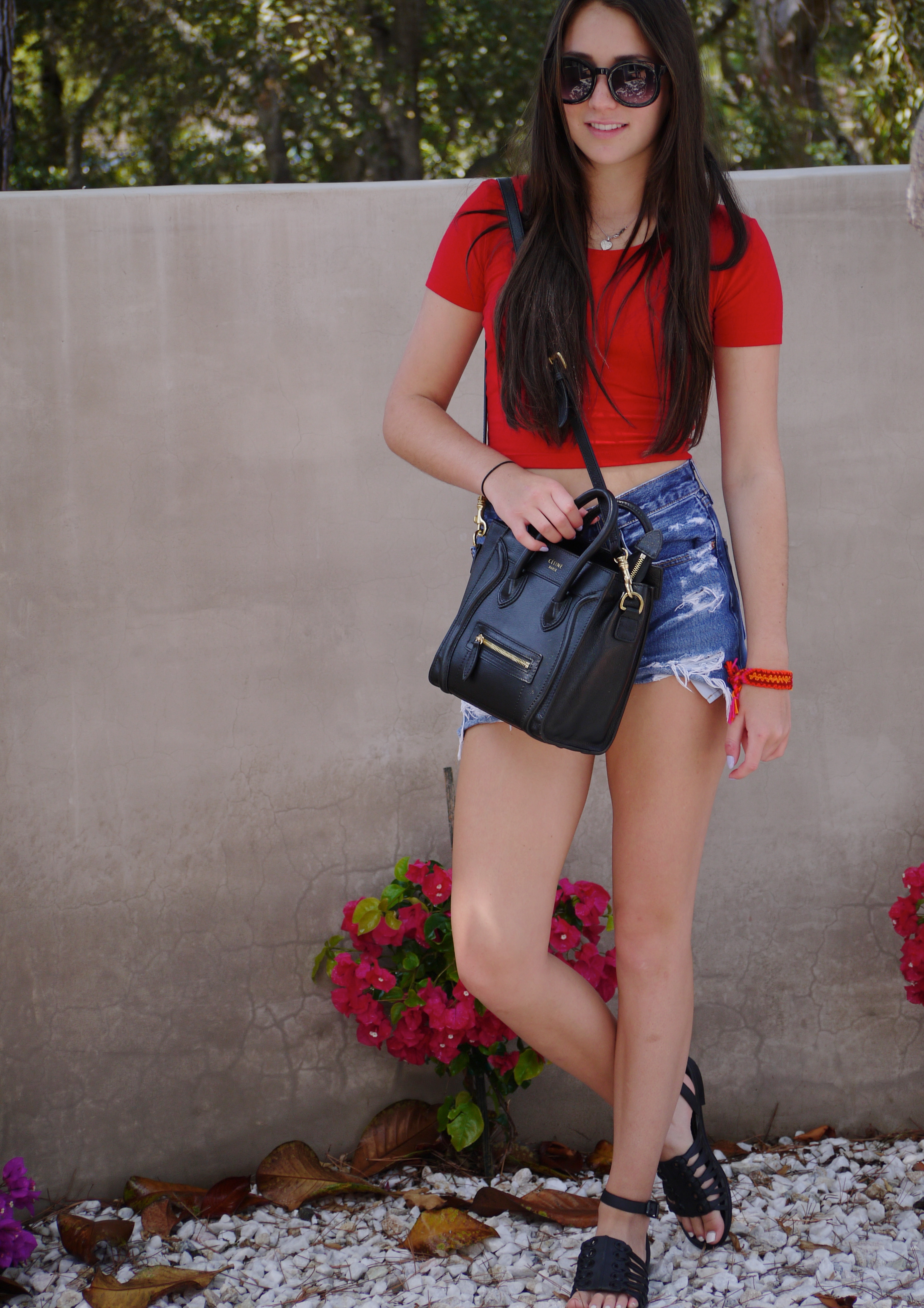 Good morning! I’m so bummed that the weather is gloomy. Summertime is supposed to be hot and sunny, but I guess not where I live! Even though it has been foggy, I’ve still been able to occupy myself by seeing movies, grabbing lunch with friends and little things like that! There are actually some great movies out right now! One that I am dying to see is called The Heat. It is supposed to be hilarious with Sandra Bullock and Melissa McCarthy. Hopefully I’ll find some time to see that this week! Alright enough of me blabbering about the weather and my plans and onto the outfit of the day! This outfit is a simple: cut off high waisted shorts, Givenchy rubber sandals, a nano Céline, and an essential POP of color! I hope you love it!